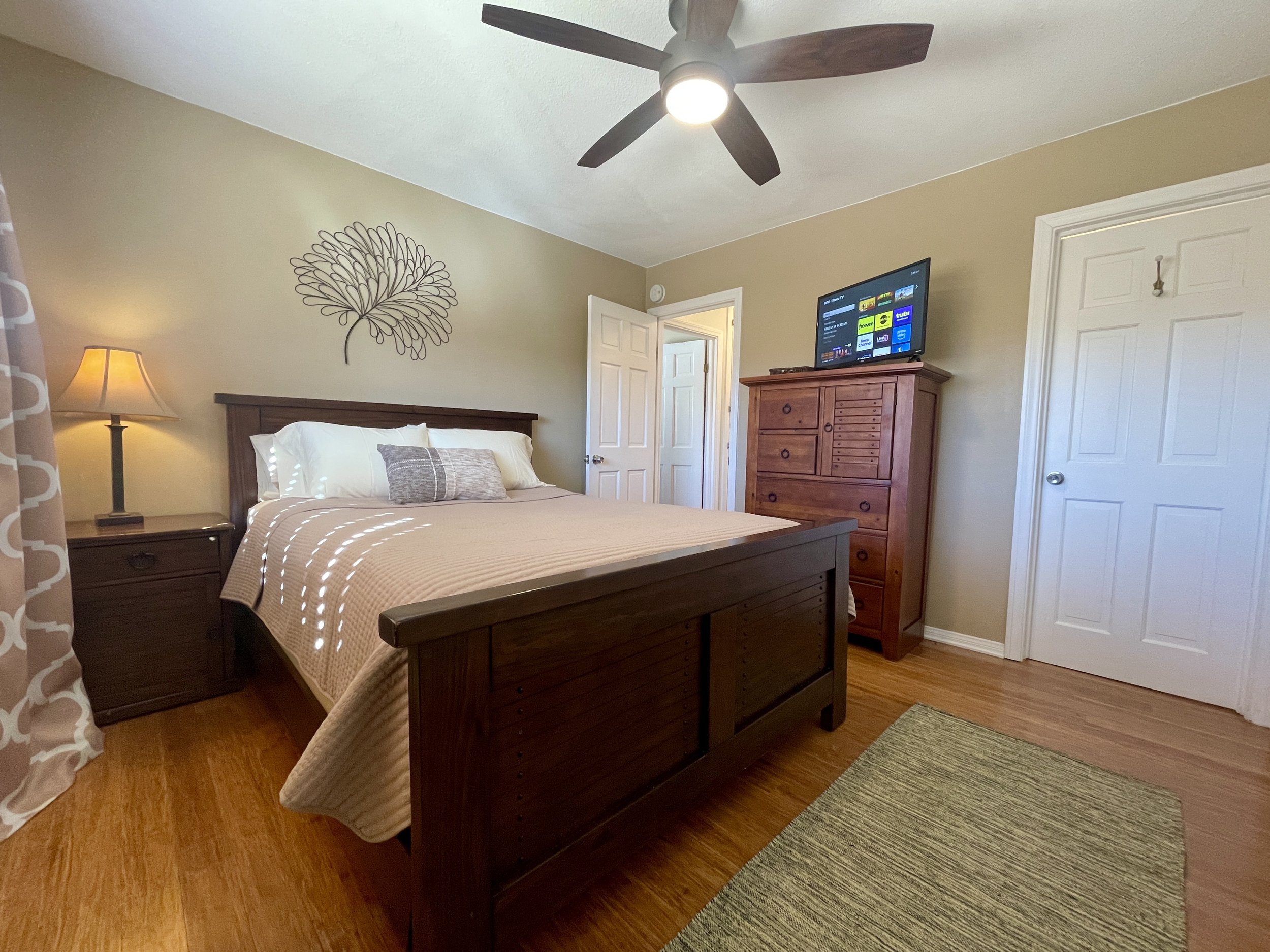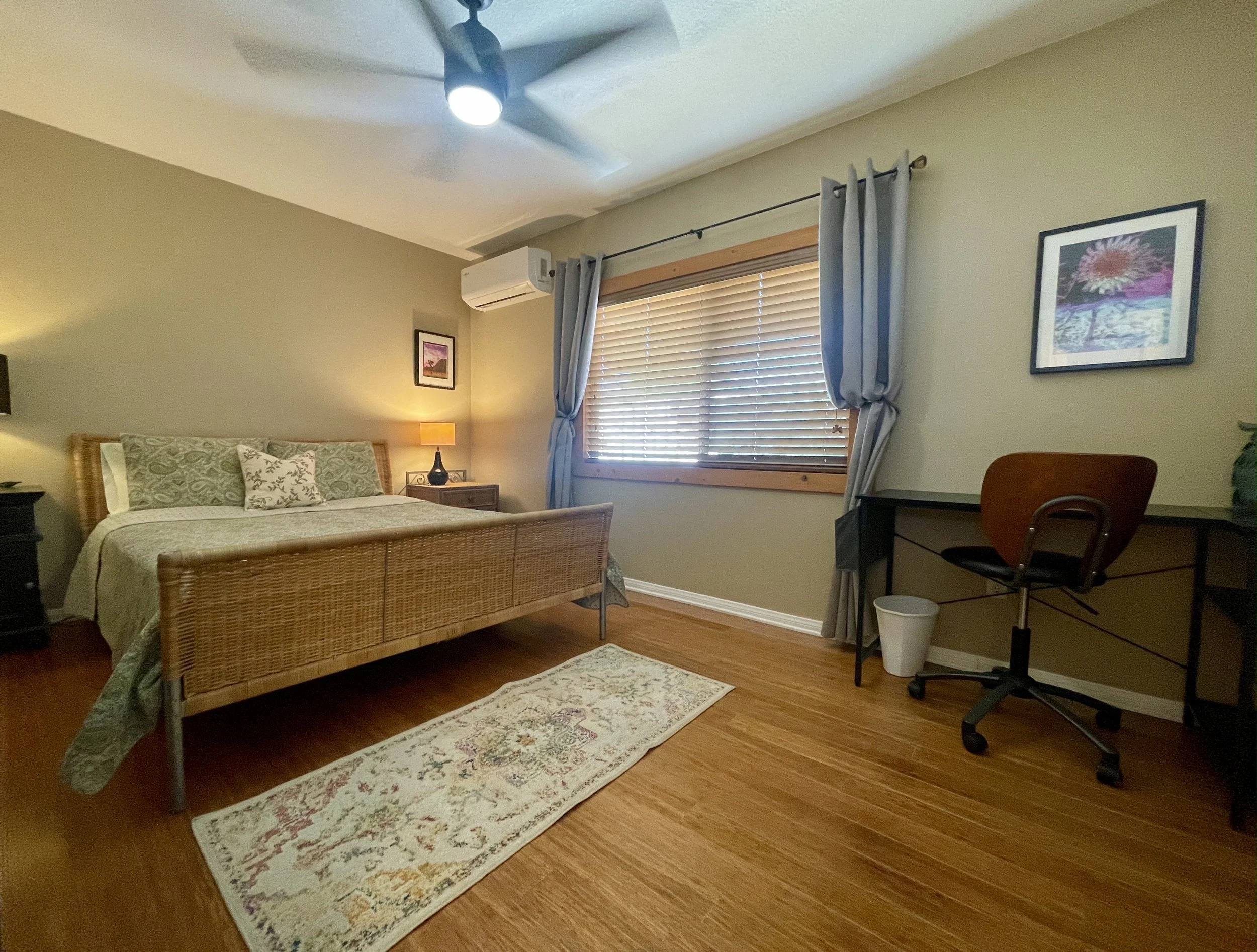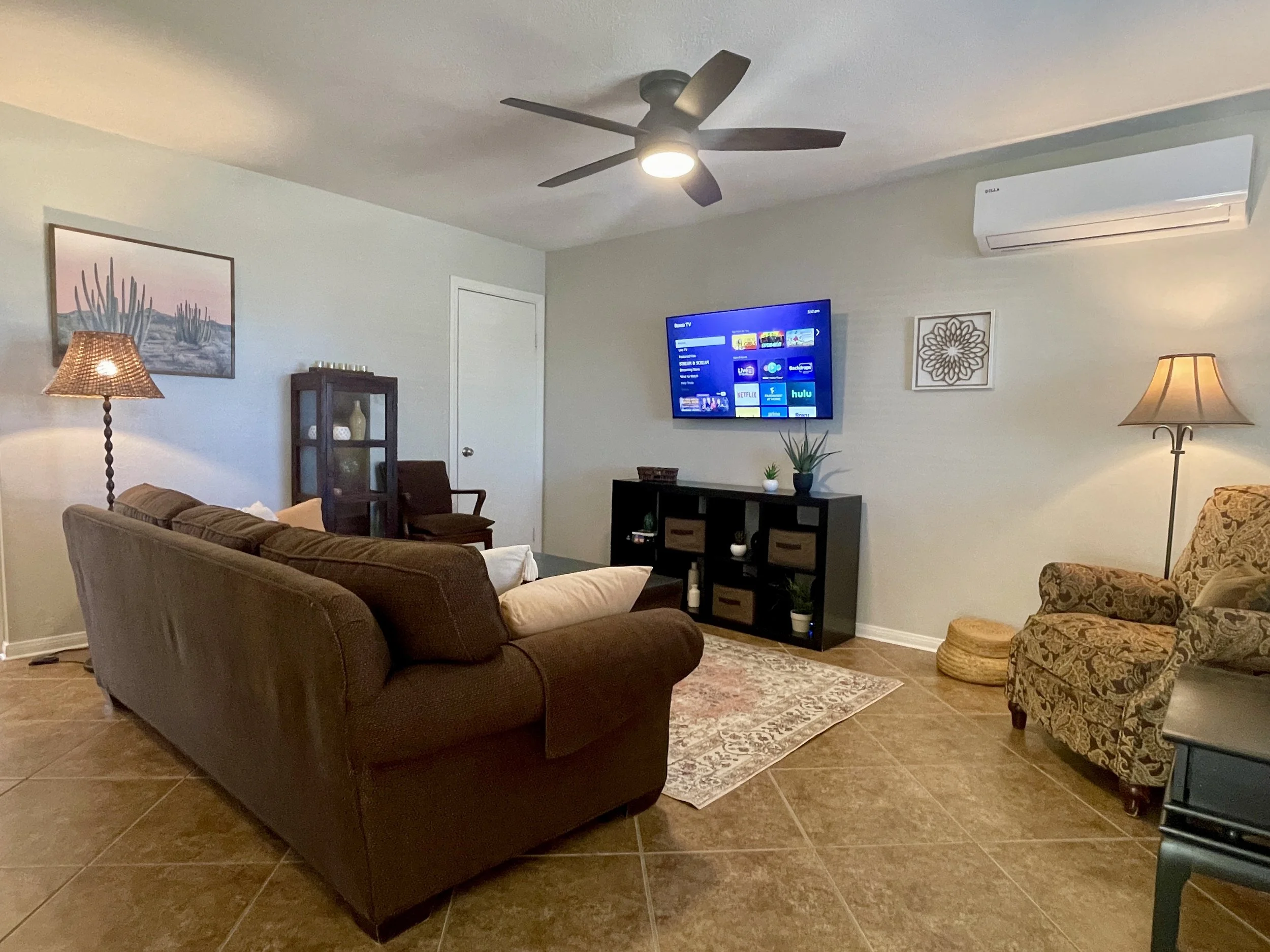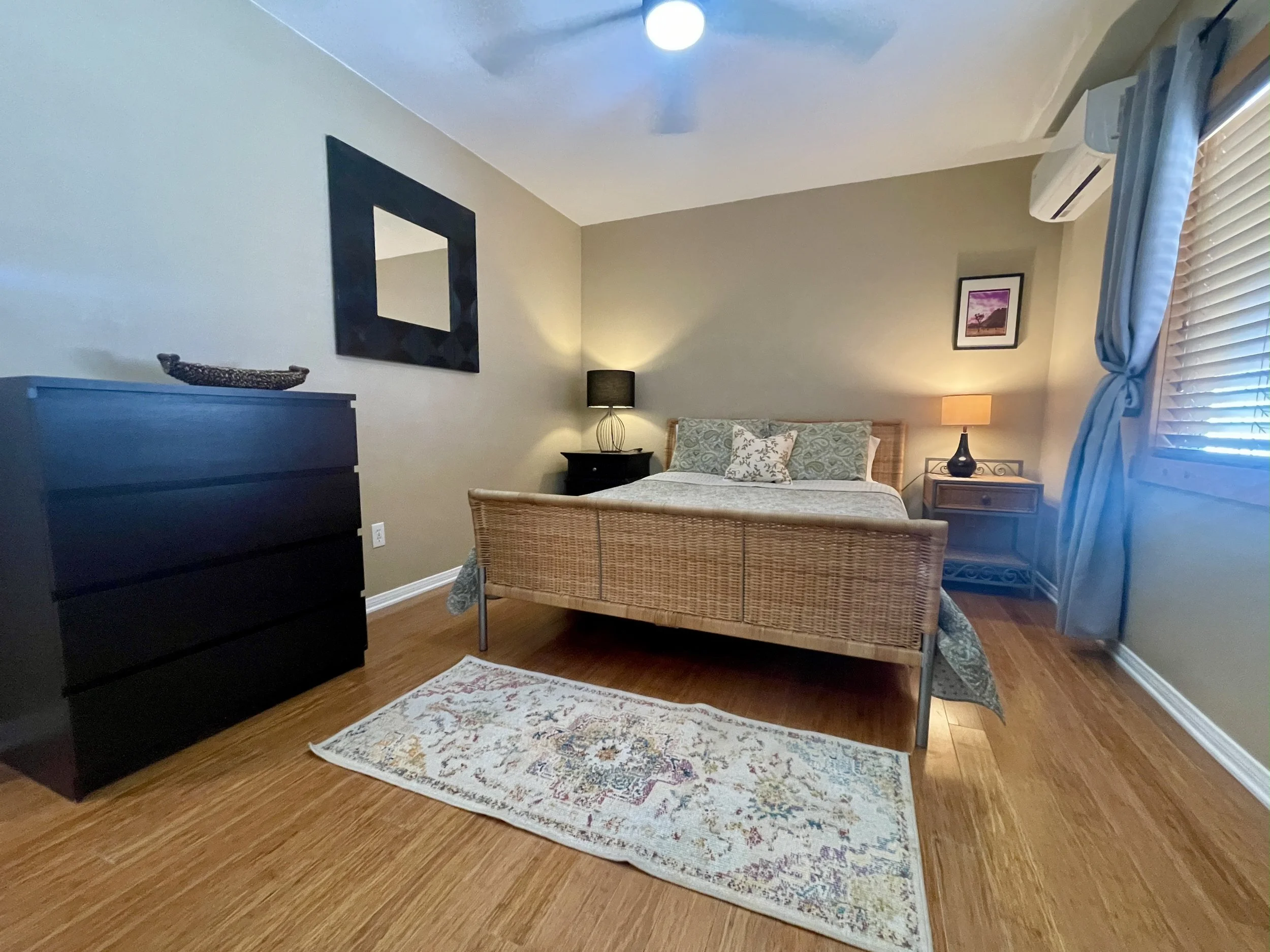The Chia house in Twentynine Palms is a fully furnished two-bedroom, one-bath home with a two-car garage. The home has a large well-appointed kitchen leading to the covered patio and fenced backyard. Inside you'll find lovely furnishings, queen-size beds in both bedrooms as well as a sleeper sofa for visiting guests. This home is the perfect accommodation for your short, long-term, or contract lease needs. Fully equipped with everything you'd need including linens, cookware, outdoor living spaces, and laundry room.