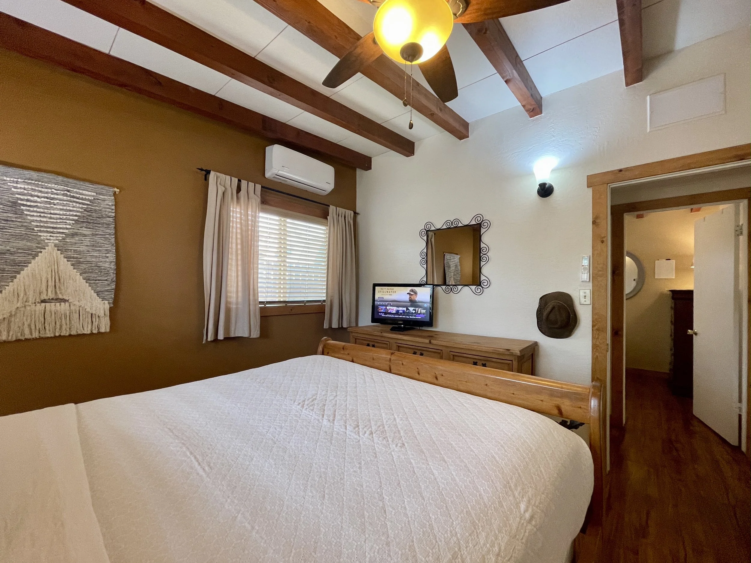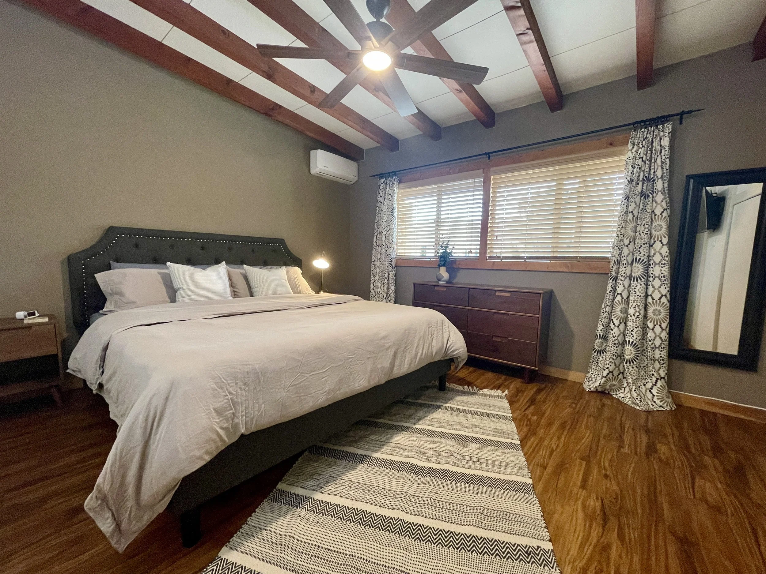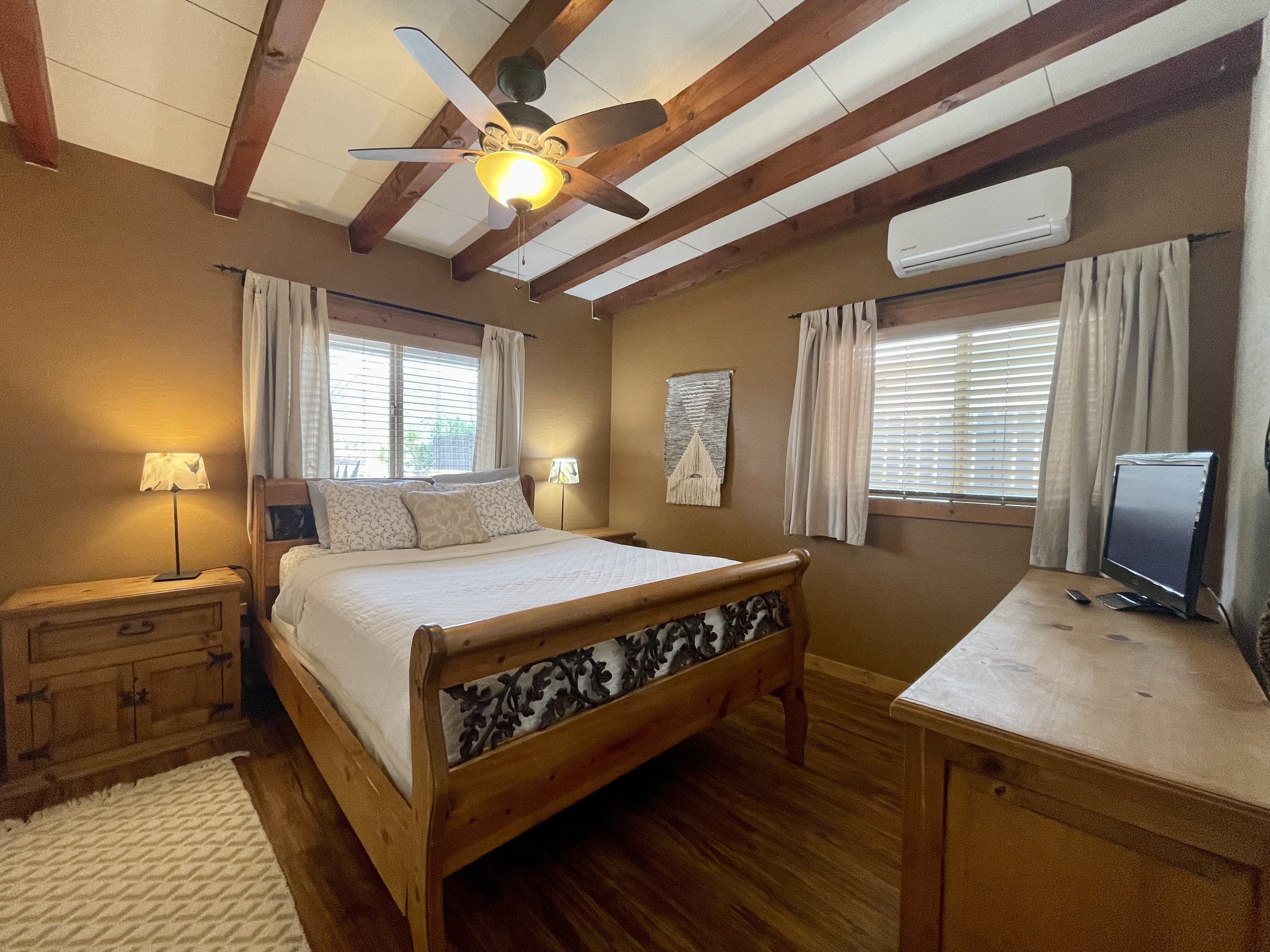 A fully furnished three-bedroom, one-bath home with a detached oversized double garage. The kitchen is galley style with granite countertops and all the modern conveniences. Beautiful gardens, views of Joshua Tree National Park, and private settings make this home a great solution for your rental home needs. As with all of our properties, the home is fully appointed with everything you’ll need from linens, dishes, kitchen appliances, a BBQ, outdoor living spaces, and laundry room.