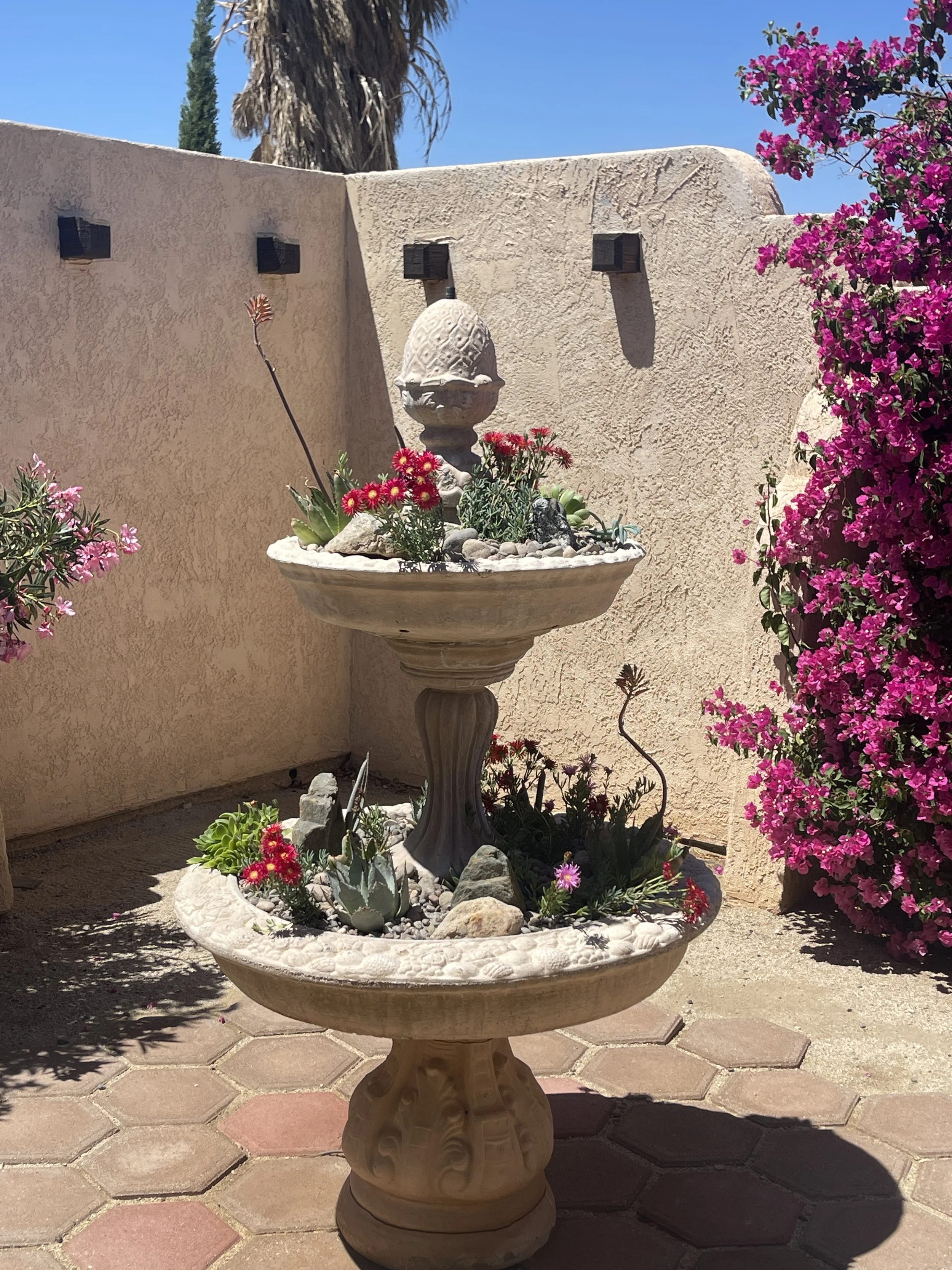 This beautiful Santa Fe style two bedrooms, one-bath rental property has a double garage, private courtyards, and in-ground pool. Furnished and outfitted with all the essentials and conveniences for your month-to-month or contract housing needs. This popular 29 Palms home is unique in style features acid concrete floors and privacy galore.